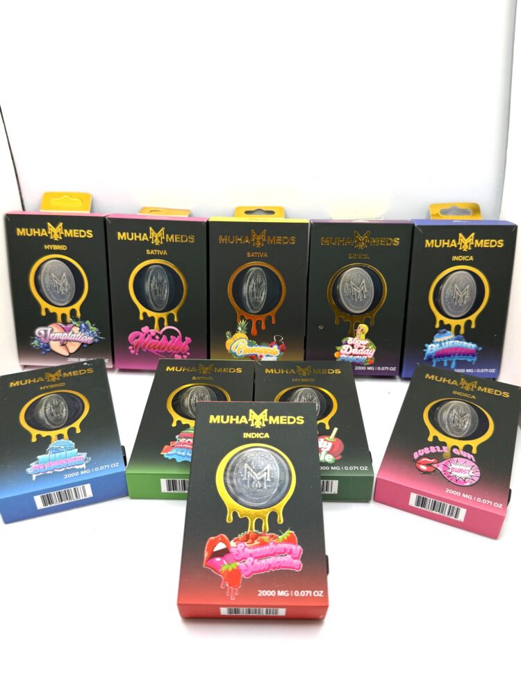 | 2g Muha Med Screwtop Flavors | Blue Slushie-Hybrid, Blueberry Muffin-Indica, Bubblegum Burst-Indica, Candy Apple-Hybrid, Habibi-Sativa, Pineapple Runtz-Sativa, Sour Watermelon Squirt-Sativa, Strawberry Shortcake-Indica, Sugar Daddy Punch-Indica, Temptation-Hybrid |