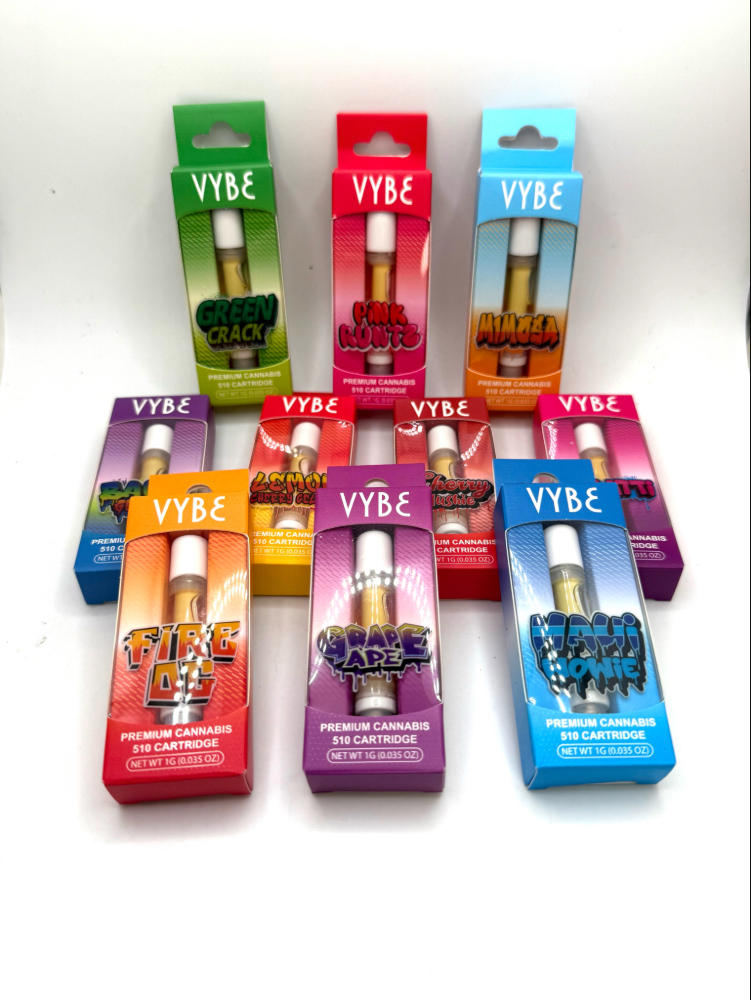 | Vybe-screwtops | Bacio Gelato, Banana Candy, Blue Razz, Candyland, Cherry Zlushie, Fire OG, Gelatti, Grape Ape, Grape Soda, Green Apple, Green Crack, Lemon Cherry Gelato, Mango Sunrise, Mauie Wowie, Mimosa, Peaches & Cream, Pina Colada, Pink Runtz, Strawnana, Watermelon Burst |